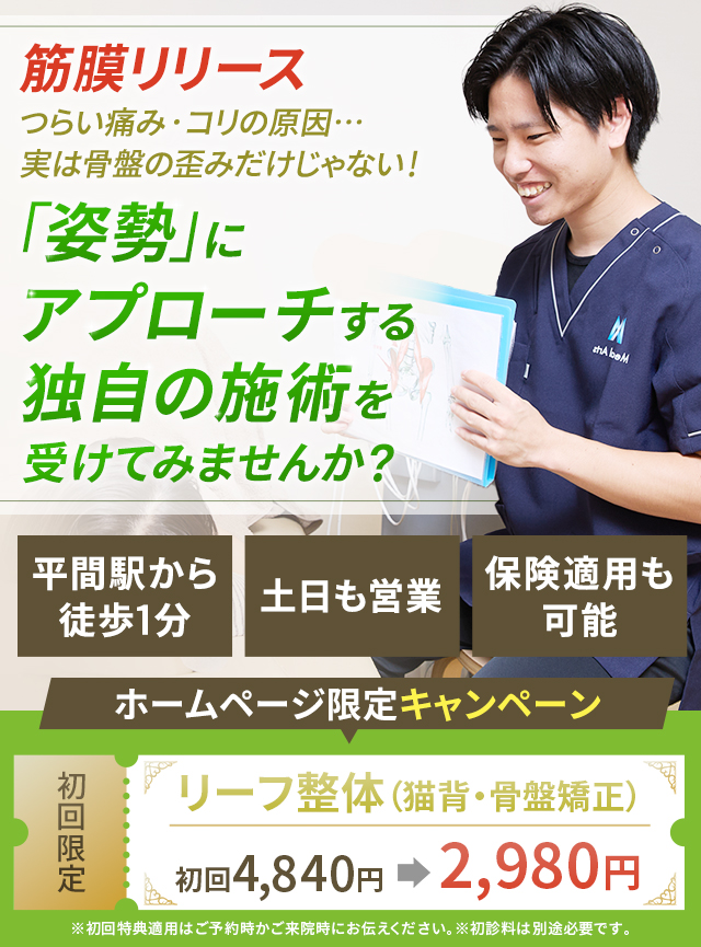 ひらま駅前整骨院の筋膜リリースは、コアマッスルセラピーという独自の施術方法を用い、筋膜だけでなく深層の筋肉まで緩めていきます!